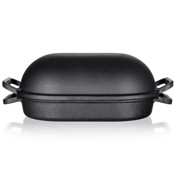 Żeliwna brytfanna EXCELLENT owalna z pokrywą o pojemności 3 + 4 l i wymiarach 39 x 26 x 14 cm w kolorze czarnym. Żeliwne naczynie do pieczenia jest idealne do pieczenia i zapiekania w piekarniku, jak również do gotowania, duszenia i smażenia na kuchence. Żeliwo jest idealne do gotowania i pieczenia. Solidny materiał, który długo utrzymuje ciepło po podgrzaniu i rozprowadza je równomiernie, pozwalając żywności piec się równomiernie, w krótszym czasie i bardziej ekonomicznie na patelni żeliwnej. Przed pierwszym użyciem należy posmarować powierzchnię patelni olejem roślinnym i stopniowo zacząć podgrzewać w piekarniku (zacznij na małym ogniu i powoli zwiększaj temperaturę). Dzięki przyrumienieniu oleju, produkt zyskuje właściwości nieprzywierające.