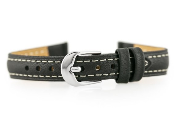 Pasek ze skóry naturalnej w kolorze czarnym z beżowymi przeszyciami. Klamerka ze stali szlachetnej w kolorze srebrnym.