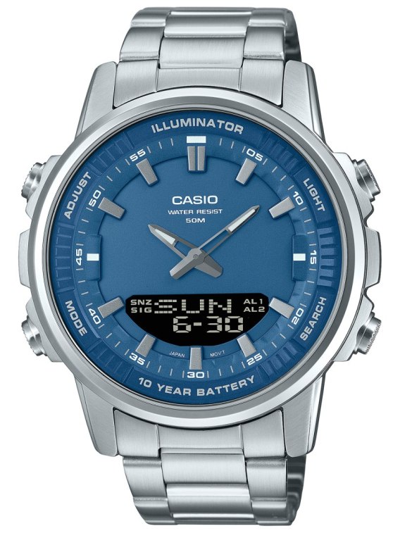 Zegarek męski CASIO AMW-880D-2A1 to połączenie elegancji, funkcjonalności i niezawodności w klasycznym stylu. Ten model zachwyca swoją uniwersalnością, idealnie sprawdzając się zarówno w codziennych sytuacjach, jak i podczas bardziej formalnych okazji. Jego okrągła, stalowa koperta w srebrnym odcieniu emanuje ciekawym designem, a jednocześnie zapewnia wytrzymałość na długie lata. Tarcza zegarka, utrzymana w niebieskiej kolorystyce, została ozdobiona wyraźnymi indeksami oraz wskazówkami pokrytymi luminescencyjną powłoką, co gwarantuje doskonałą czytelność nawet w warunkach słabego oświetlenia.