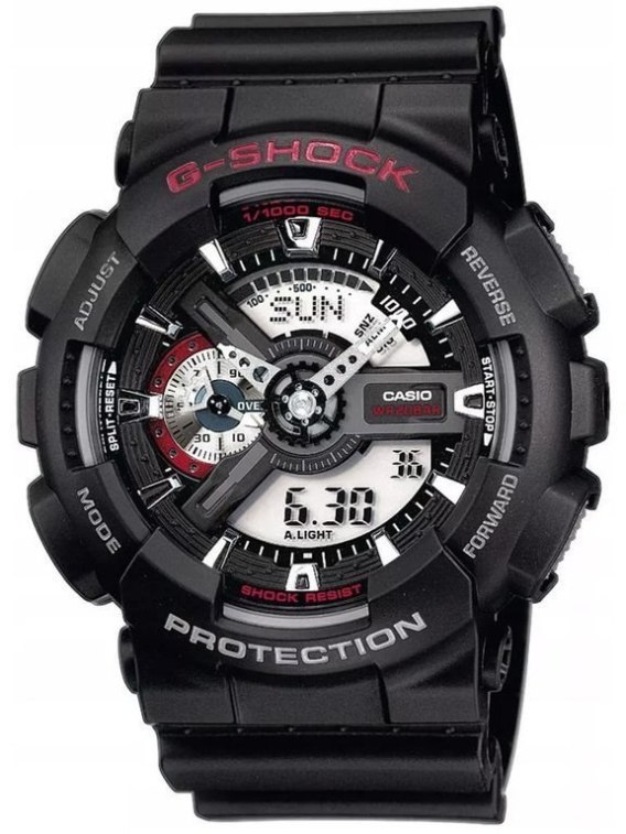 Funkcjonalność zegarka nie kończy się na jego wytrzymałości. Casio GA-110-1AER oferuje szeroką gamę przydatnych opcji - od stoperów, przez alarmy, po możliwość ustawienia drugiego czasu. Jego podświetlenie LED umożliwia komfortowe odczytanie godziny nawet w ciemnościach, a duży cyfrowo-analogowy wyświetlacz pozwala na łatwe śledzenie informacji. Zegarek jest także wodoodporny na poziomie 200 metrów, co czyni go doskonałym wyborem do aktywności nad wodą - zarówno pływania, jak i nurkowania.