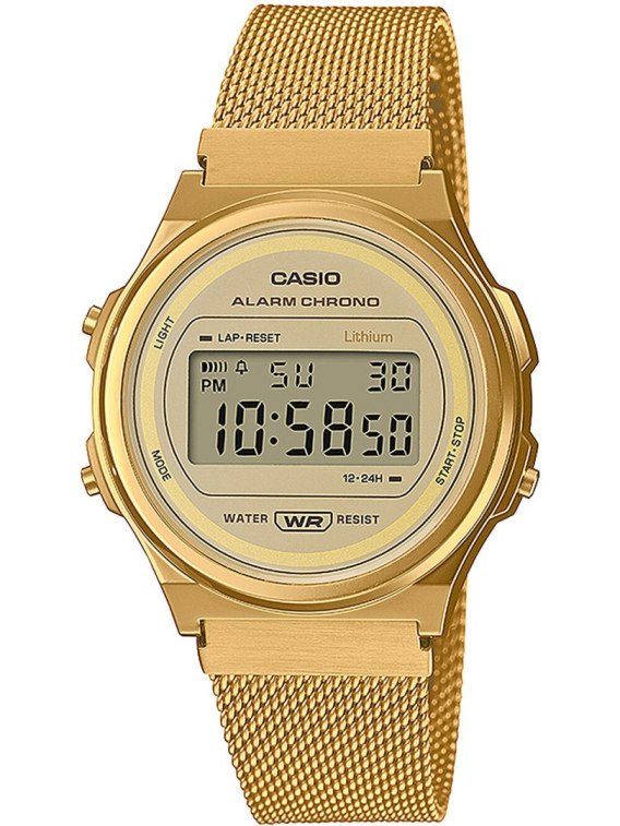 Delikatna złota obudowa w połączeniu z minimalistycznym wyświetlaczem dodaje zegarkowi szyku, zachowując przy tym pełną czytelność. Choć jego rozmiar jest subtelny, wciąż emanuje elegancją, dzięki czemu z łatwością dopasuje się do różnych stylizacji - od codziennych, po bardziej formalne. Zegarek Casio Vintage A171WEMG-9A to także doskonały wybór dla kobiet, które cenią sobie komfort i prostotę - wbudowany mechanizm kwarcowy zapewnia niezawodność i precyzję, a wyświetlacz LCD sprawia, że odczyt godziny jest szybki i łatwy.