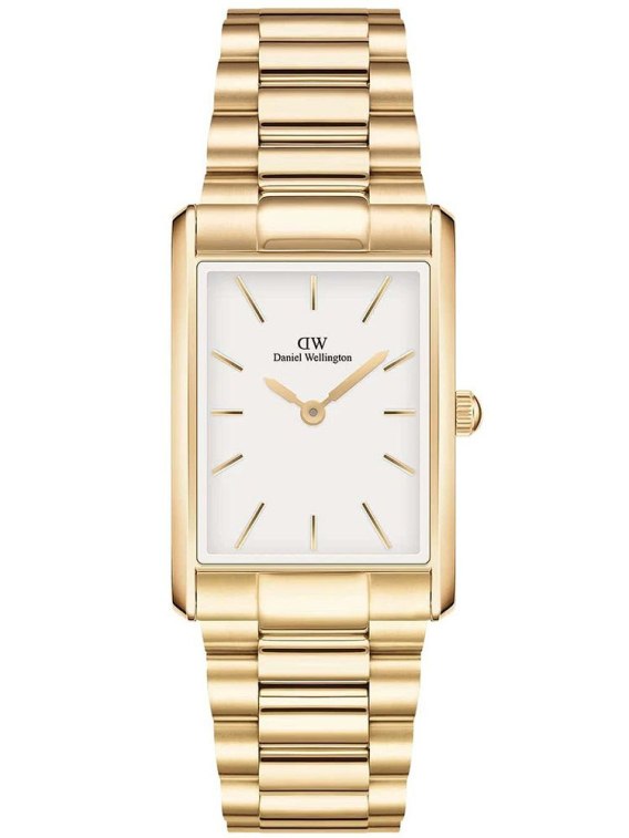 Daniel Wellington DW00100703 to stylowy damski zegarek, który wyróżnia się elegancką, prostokątną kopertą o delikatnie zaokrąglonych krawędziach oraz subtelną, trzyrzędową bransoletą, idealnie zintegrowaną z całością.