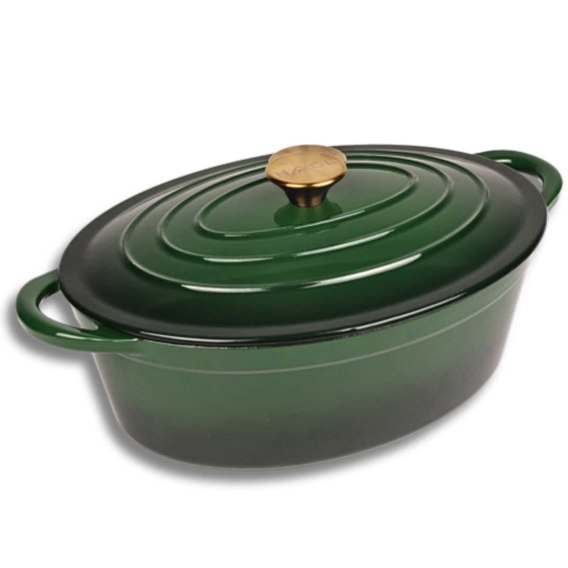Odkryj niezrównany smak i aromat potraw dzięki naszej emaliowanej brytfannie żeliwnej w przepięknym kolorze butelkowej zieleni. To wszechstronne i niezastąpione naczynie w każdej kuchni, które łączy w sobie tradycyjną solidność żeliwa z nowoczesną elegancją.Idealne do pieczenia, duszenia, zapiekania i gotowania, pozwoli Ci na nowo odkryć radość z tworzenia kulinarnych arcydzieł.