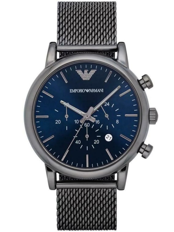 Męski zegarek Emporio Armani AR1979 z serii Luigi to stylowy męski zegarek, idealny zarówno do eleganckiego ubioru, jak i do noszenia na co dzień. Bransoleta typu mesh oraz koperta wykonane zostały ze stali szlachetnej z powłoką w odcieniu grafitowym. Na granatowej tarczy zabezpieczonej mineralnym szkłem znajdziemy datownik wskazujący dzień miesiąca oraz subtarcze będące wskazaniami chronografu oraz czasu dobowego.