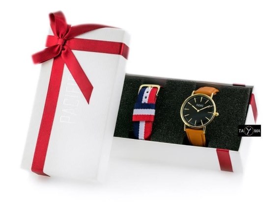 W komplecie dodatkowy parciany pasek w kolorach białym, czerwonym i granatowym oraz gustowne pudełko prezentowe