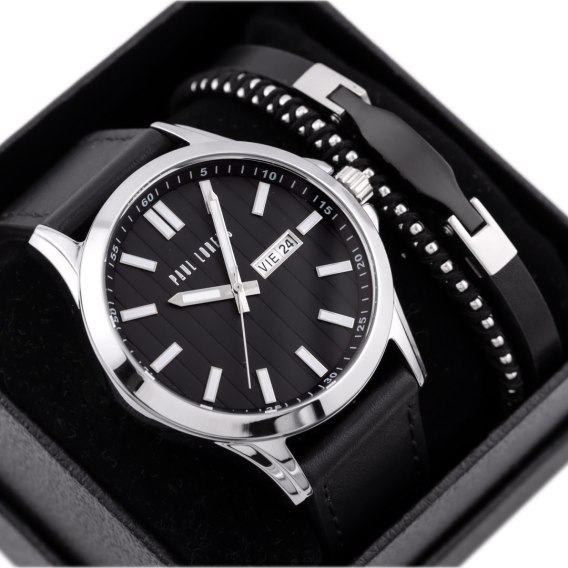 Komplet prezentowy męski, który łączy elegancję z ponadczasowym stylem. Zawiera zegarek marki Paul Lorens, na czarnym pasku, z klasyczną, czarną tarczą ozdobioną srebrnym indeksem, co nadaje mu subtelną i wyrafinowaną estetykę. Srebrna koperta zegarka doskonale komponuje się z całością, tworząc wyjątkowy design. Zegarek charakteryzuje się wodoszczelnością WR30, co zapewnia jego funkcjonalność i trwałość. Komplet zawiera również skórzaną, czarna bransoletę ze srebrnymi elementami, która stanowi doskonałe uzupełnienie całości. To idealny wybór na święta - elegancki, męski i wyjątkowy prezent, który zachwyci każdego.