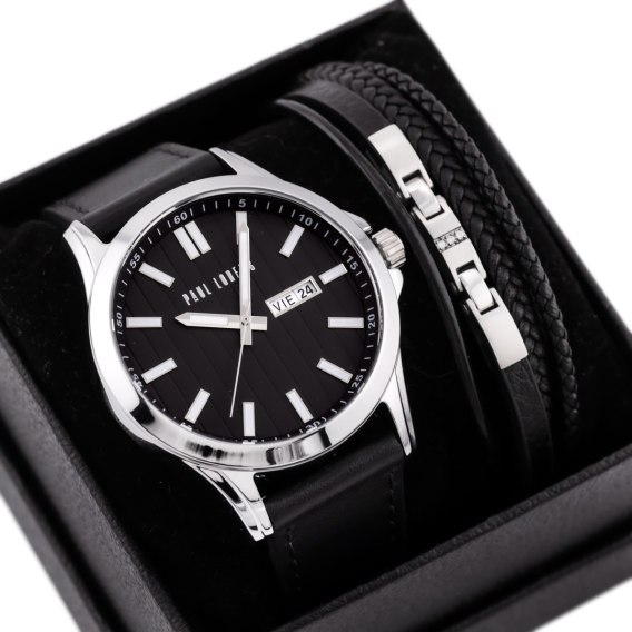 Komplet prezentowy męski, który łączy elegancję z ponadczasowym stylem. Zawiera zegarek marki Paul Lorens, na czarnym pasku, z klasyczną, czarną tarczą ozdobioną indeksem w kolorze srebrnym, co nadaje mu subtelną i wyrafinowaną estetykę. Koperta zegarka w kolorze srebrnym doskonale komponuje się z całością, tworząc wyjątkowy design. Zegarek charakteryzuje się wodoszczelnością WR30, co zapewnia jego funkcjonalność i trwałość. Komplet zawiera również skórzaną, czarna bransoletę z elementamisrebrnymi, która stanowi doskonałe uzupełnienie całości. To idealny wybór na święta - elegancki, męski i wyjątkowy prezent, który zachwyci każdego.