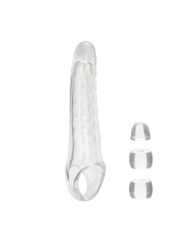 Zestaw Performance Maxx Clear Extension Kit rewolucjonizuje intymne spotkania, zwiększając zarówno długość, jak i obwód. Dzięki solidnej, ultra-miękkiej główce o średnicy 3,75" / 9,5 cm zapewnia głęboko satysfakcjonujące doznania dla partnerów. Wykonany z rozciągliwego, przezroczystego materiału, podkreśla naturalne atuty, sprawiając realistyczne odczucie. Jego wydrążona konstrukcja z wbudowanym paskiem na mosznę zwiększa stabilność. Trzy stopery umożliwiają dopasowanie dla maksymalnego komfortu. Wykonany z bezpiecznego dla ciała, bezzapachowego materiału bez ftalanów, gwarantuje beztroską przyjemność. To więcej niż przedłużenie, to brama do nowych wymiarów przyjemności, wzmacniająca intymne chwile.