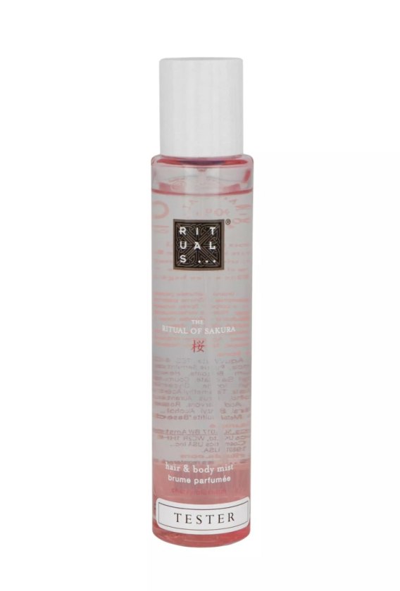 Rituals The Ritual Of Sakura Hair & Body Mist 50 ml to delikatna mgiełka do ciała i włosów, która zapewnia odświeżenie oraz subtelny, kwiatowy zapach inspirowany rytuałem Sakura. Produkt lekko perfumuje skórę i włosy, otulając je przyjemną, harmonijną wonią kwiatów wiśni, pozostawiając uczucie świeżości i lekkości. Formuła jest łagodna, nie obciąża włosów ani nie pozostawia tłustej warstwy na skórze, dzięki czemu mgiełkę można stosować wielokrotnie w ciągu dnia dla szybkiego odświeżenia aromatu. Tester zawiera pełnowartościowy produkt o takiej samej jakości i wydajności jak standardowa wersja, pozwalając poznać jego właściwości przed zakupem większego opakowania. Mgiełka idealnie sprawdza się w podróży, do codziennego stosowania w pracy lub w domu, łącząc pielęgnację i subtelne perfumowanie ciała i włosów w jednym.
