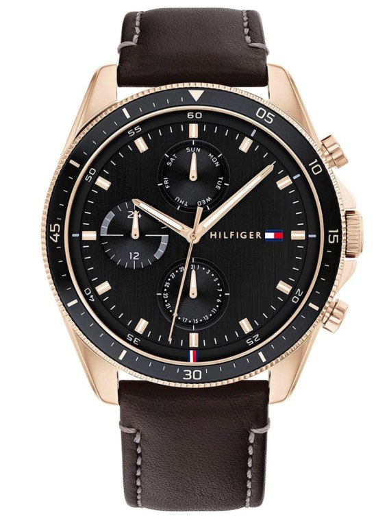Tommy Hilfiger Parker 1791836 to elegancki zegarek męski, który łączy czarny, skórzany pasek z kopertą ze stali nierdzewnej w kolorze złota. Jego czarna tarcza, zabezpieczona szkłem mineralnym, wyróżnia się dodatkowymi funkcjami - datownikami dnia miesiąca i tygodnia oraz sub-tarczą wskazującą czas dobowy. Zegarek działa na mechanizmie kwarcowym, zapewniając precyzyjne odmierzanie czasu.