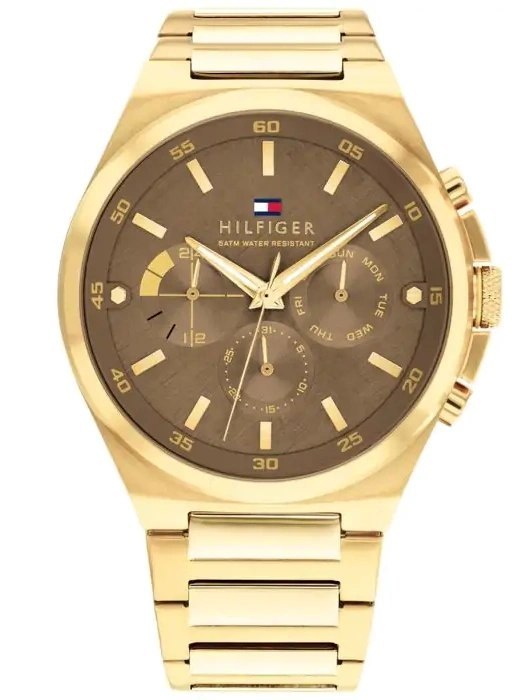 Zegarek męski TOMMY HILFIGER DEXTER 1792090 to nowoczesny i elegancki model do noszenia na co dzień. Koperta oraz bransoleta wykonana wysokiej klasy stali szlachetnej 316L, odpornej na korozję oraz hipoalergicznej w kolorze złotym. Na oryginalnej brązowej tarczy, ze szlifem słonecznym znajdują się subtarcze wskazujące: dzień miesiąca, dzień tygodnia oraz czas 24 godzinny. Całość chroniona szkłem mineralnym. Za odmierzanie czasu w zegarku Tommy Hilfiger 1792090 odpowiada mechanizm kwarcowy, do którego energia go zasilająca pochodzi z baterii. Model DEXTER 1792090 posiada wodoszczelność na poziomie 5ATM co czyni go w niewielkim stopniu odpornym za wodę. Całość dopracowano w najdrobniejszym szczególe oraz zaprojektowano w zgodzie z aktualnymi trendami w modzie, otrzymując klasyczny, ale jakże elegancki zegarek.