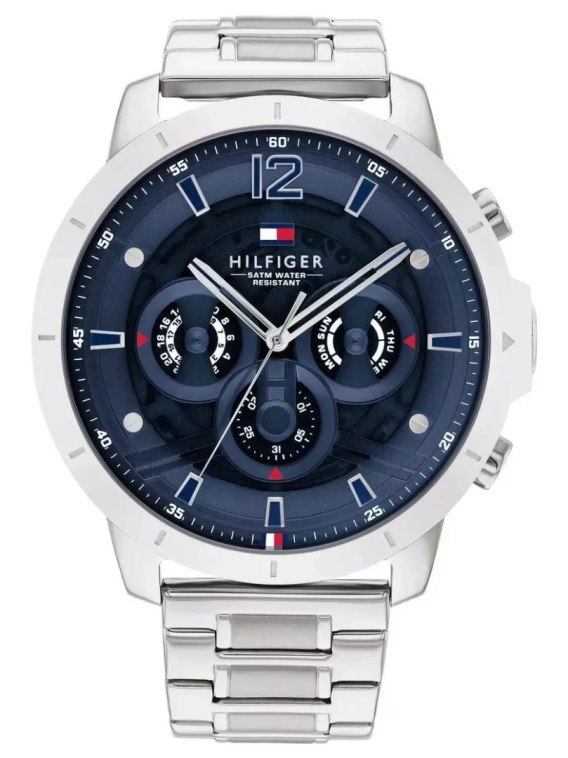 Zegarek męski Tommy Hilfiger LUCA 1710492 to modowy model w stylu casual, który pasuje do wielu stylizacji. Koperta w kolorze srebrnym wykonana z mocnej stali szlachetnej jest odporna na korozję, szkło mineralne na tarczy jest bardzo odporne na stłuczenia i zarysowania, oraz bransoleta w kolorze srebrnym wykonana ze stali szlachetnej. Granatowa tarcza została wyposażona w funkcjonalne subtarcze czasu 24h, datownika dni tygodnia oraz datownika dni miesiąca. Wodoszczelność zegarka jest na poziomie 5 ATM, można z nim się bezpiecznie kąpać.