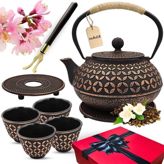 Żeliwo doskonale zatrzymuje ciepło, a emaliowana powłoka ułatwia utrzymanie czystości i poprawia estetykę. Czajnik wyposażony jest w ergonomiczny uchwyt oraz pokrywkę, a w zestawie znajdują się czarki, które umożliwiają komfortowe picie herbaty.